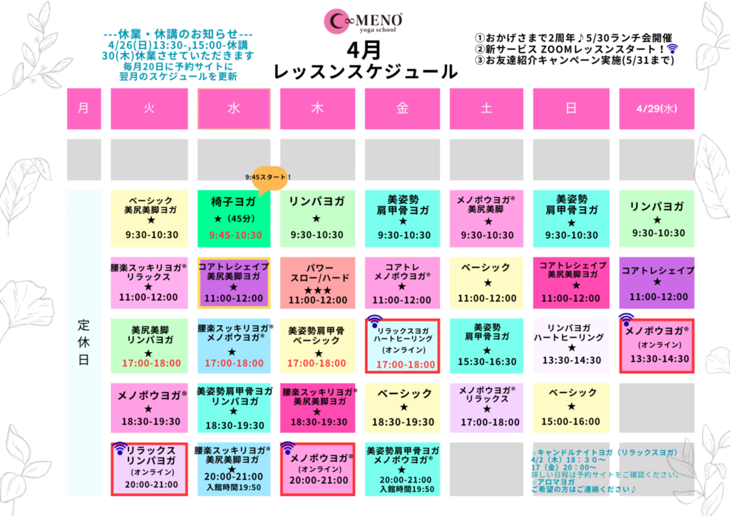 美姿勢肩甲骨ヨガ、メノポウヨガ®(更年期)、リンパヨガ、リラックスヨガ、椅子ヨガ、ベーシックをお勧めします。