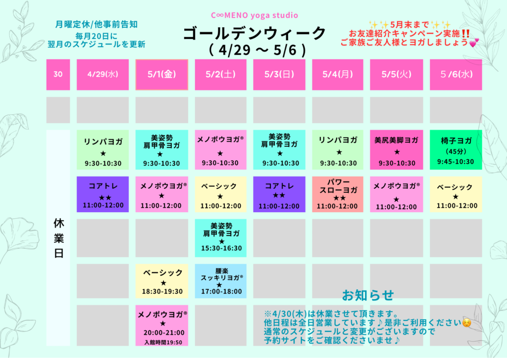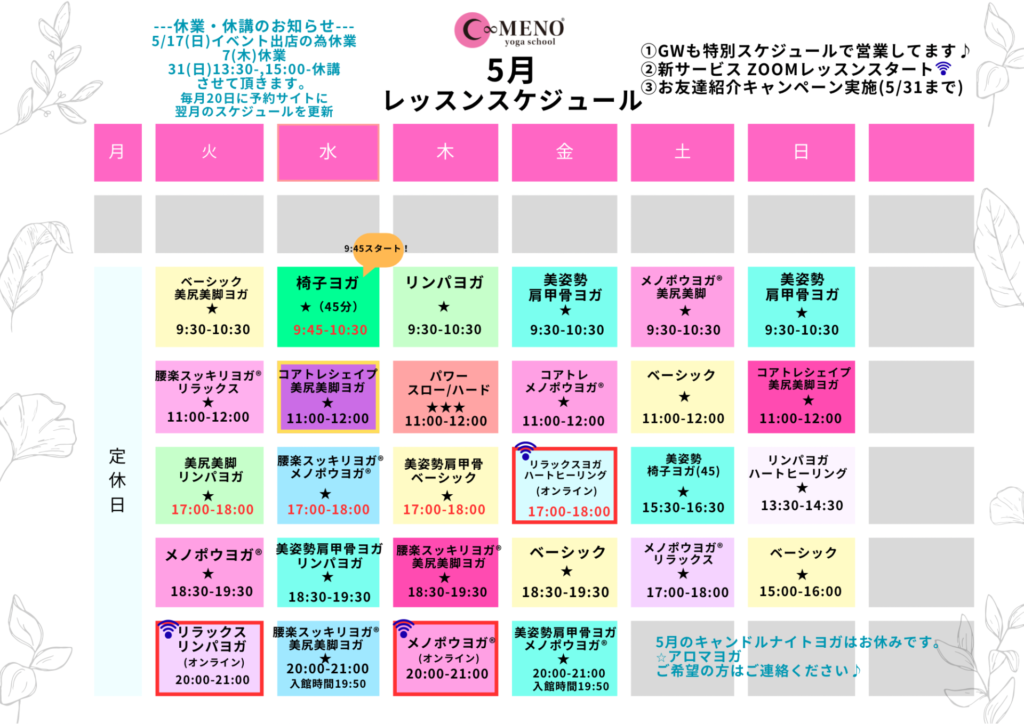 若葉マークのついたレッスンはどのレッスンでも参加可能です。ヨガが初めての方は