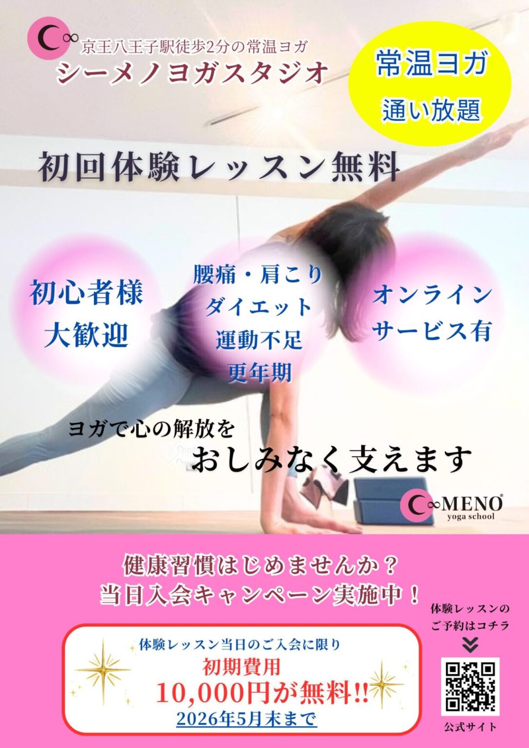 子育て、仕事の合間に八王子市内で通えるスタジオを探していたところ、シーメノに出会いました。ご経験豊富なちさと先生の丁寧で細やかな指導、レッスンの時間や種類が多くて、ライフワークの中に組み込みやすく大満足です。大好きなヨガをもっと深く学び伝えていきたいと思い、現在インストラクター資格講座に参加中です。好きなヨガを楽しく学べて充実しています。これからがますます楽しみです。